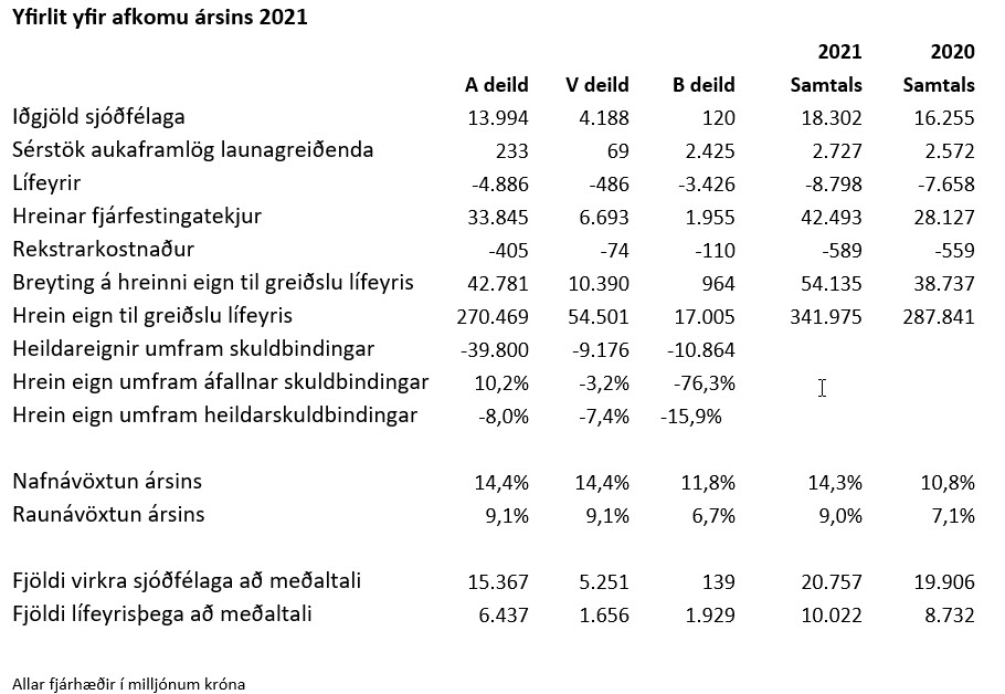 Hrein eign sjóðsins til greiðslu lífeyris í árslok nam 342,0 ma.kr. en var 287,8 ma.kr. í lok árs 2020 og hækkaði því um 54,1 ma.kr. milli ára. Hrein nafnávöxtun nam 14,3% og hrein raunávöxtun 9,0% sem er hæsta raunávöxtun frá árinu 2003.